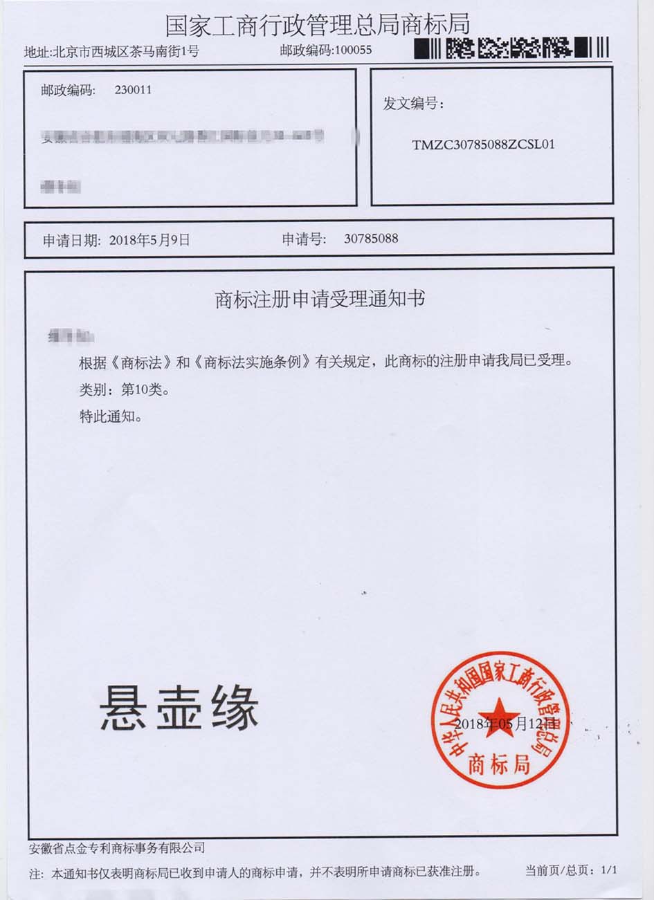 第10类“悬壶缘”商标受理通知书