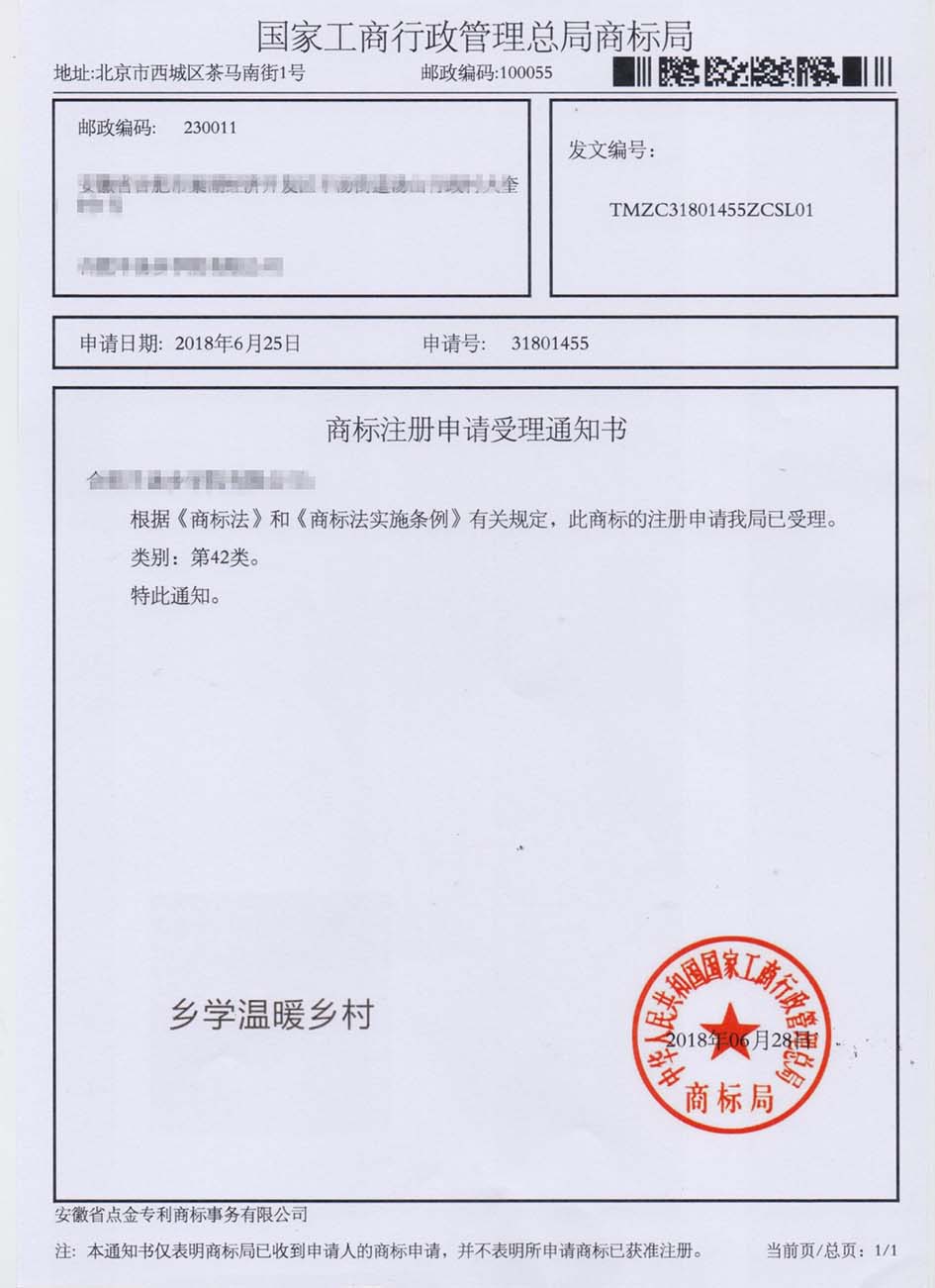 第42类“乡学温暖乡村”商标受理通知书