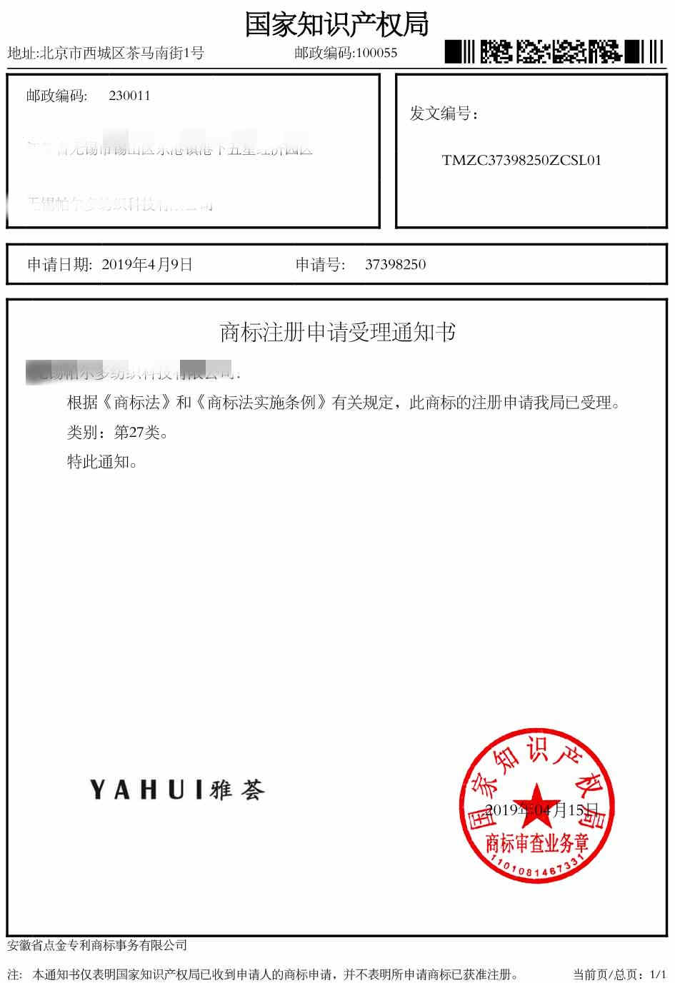 第27类“雅荟”受理通知书