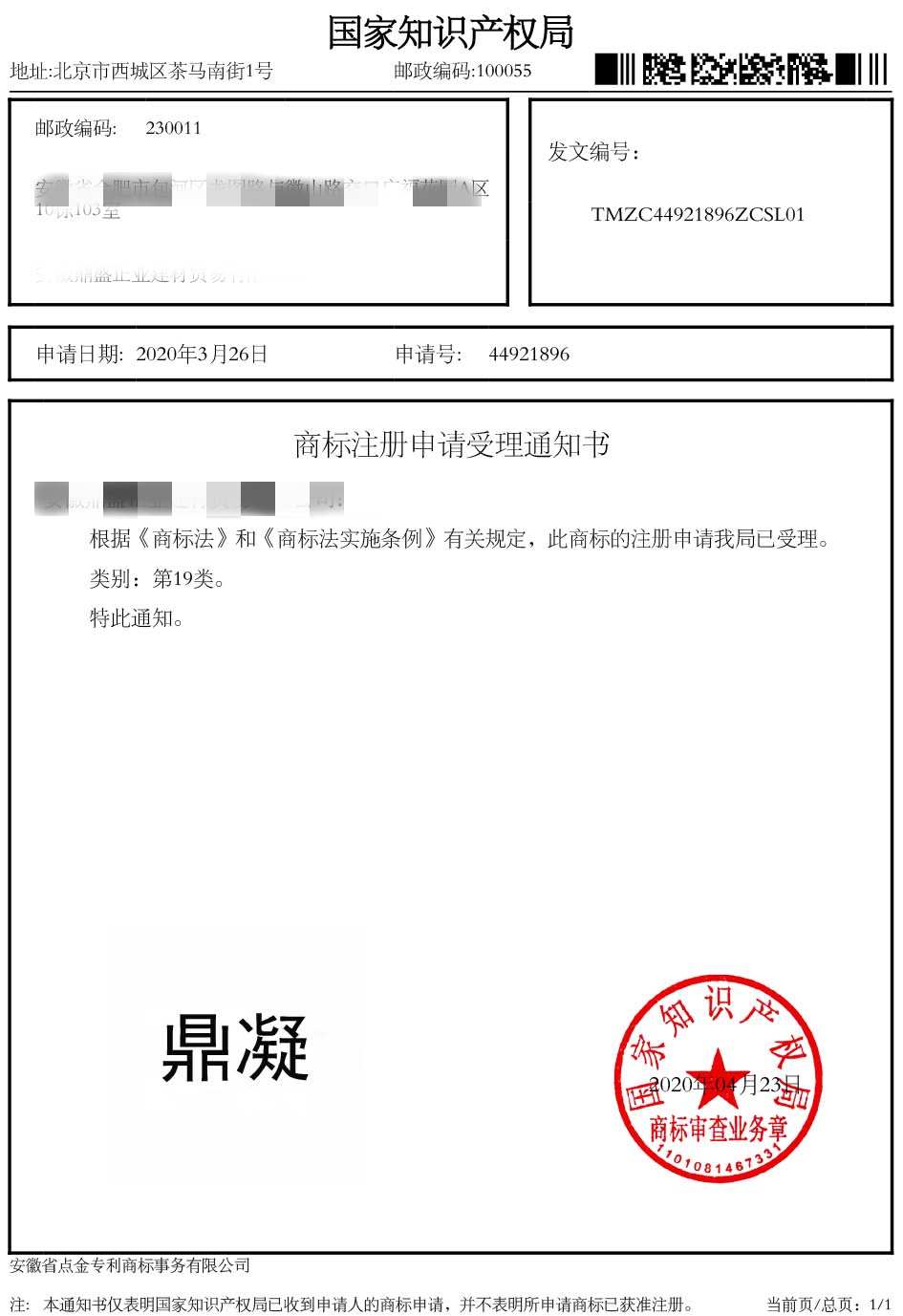 第19类“鼎凝”商标受理通知书