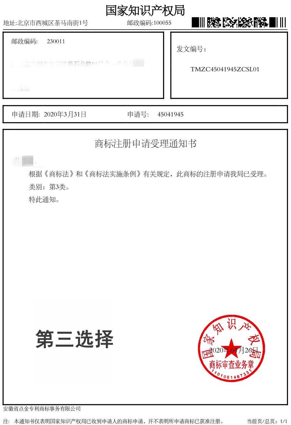 第3类“第三选择”商标受理通知书
