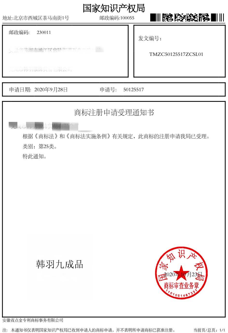 第25“韩羽九成品”商标受理通知书