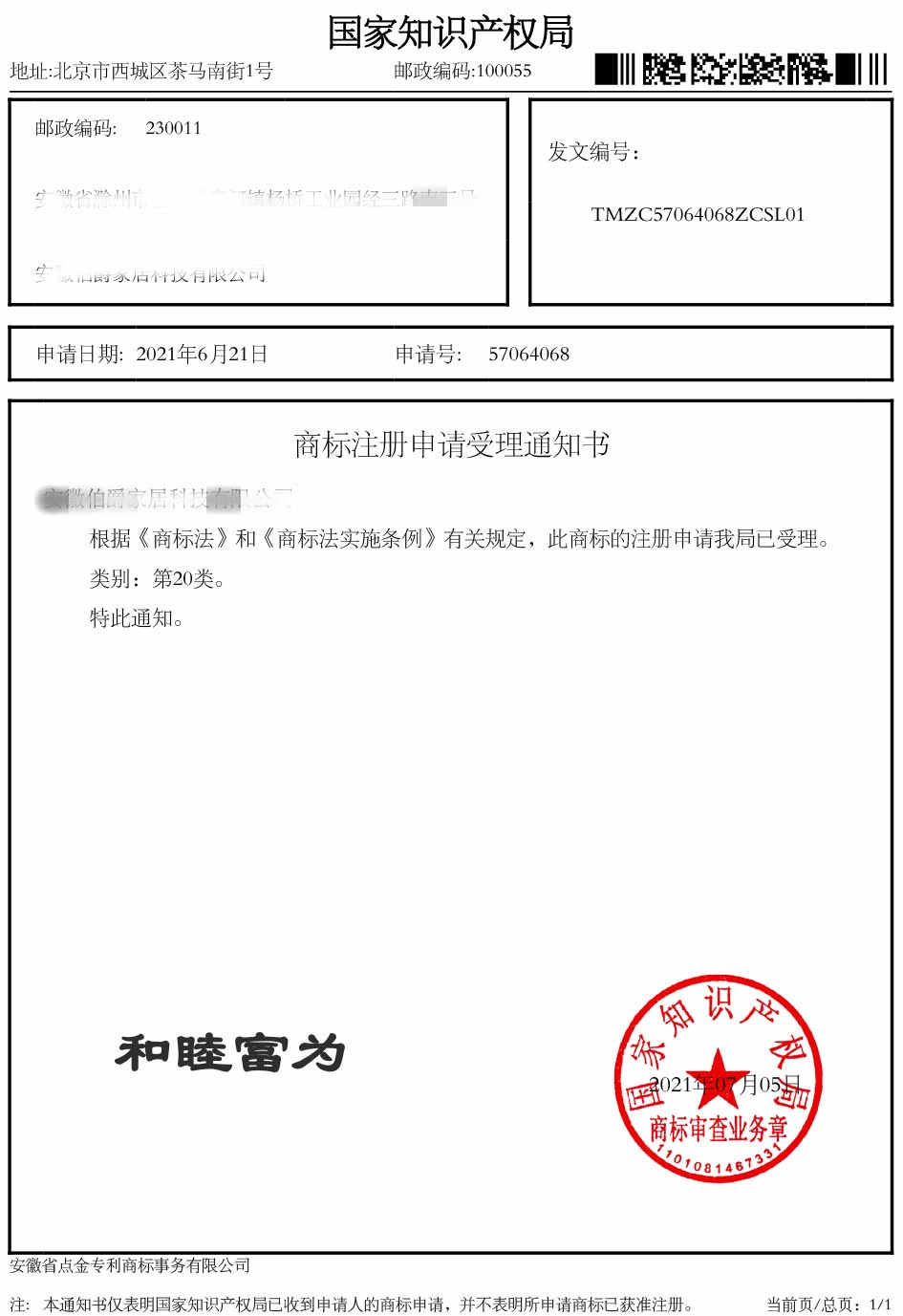 第20类“和睦富为”受理通知书