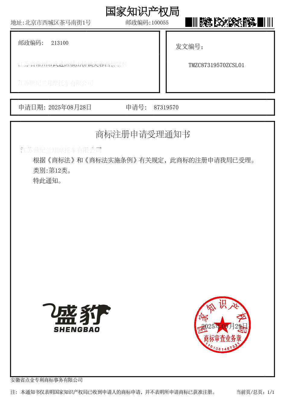第12类“盛豹”商标受理通知书