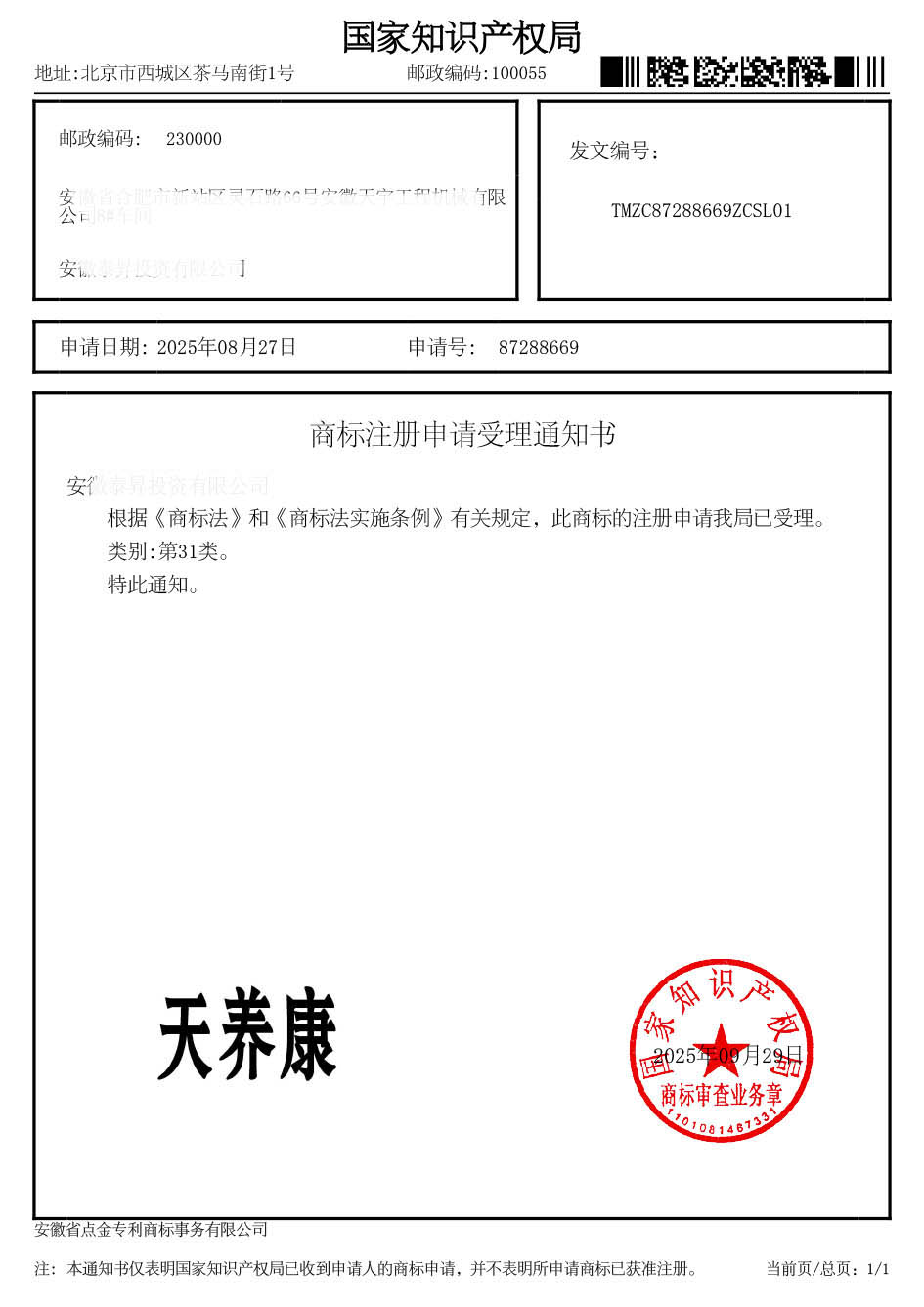 第31类“天养康”商标受理通知书