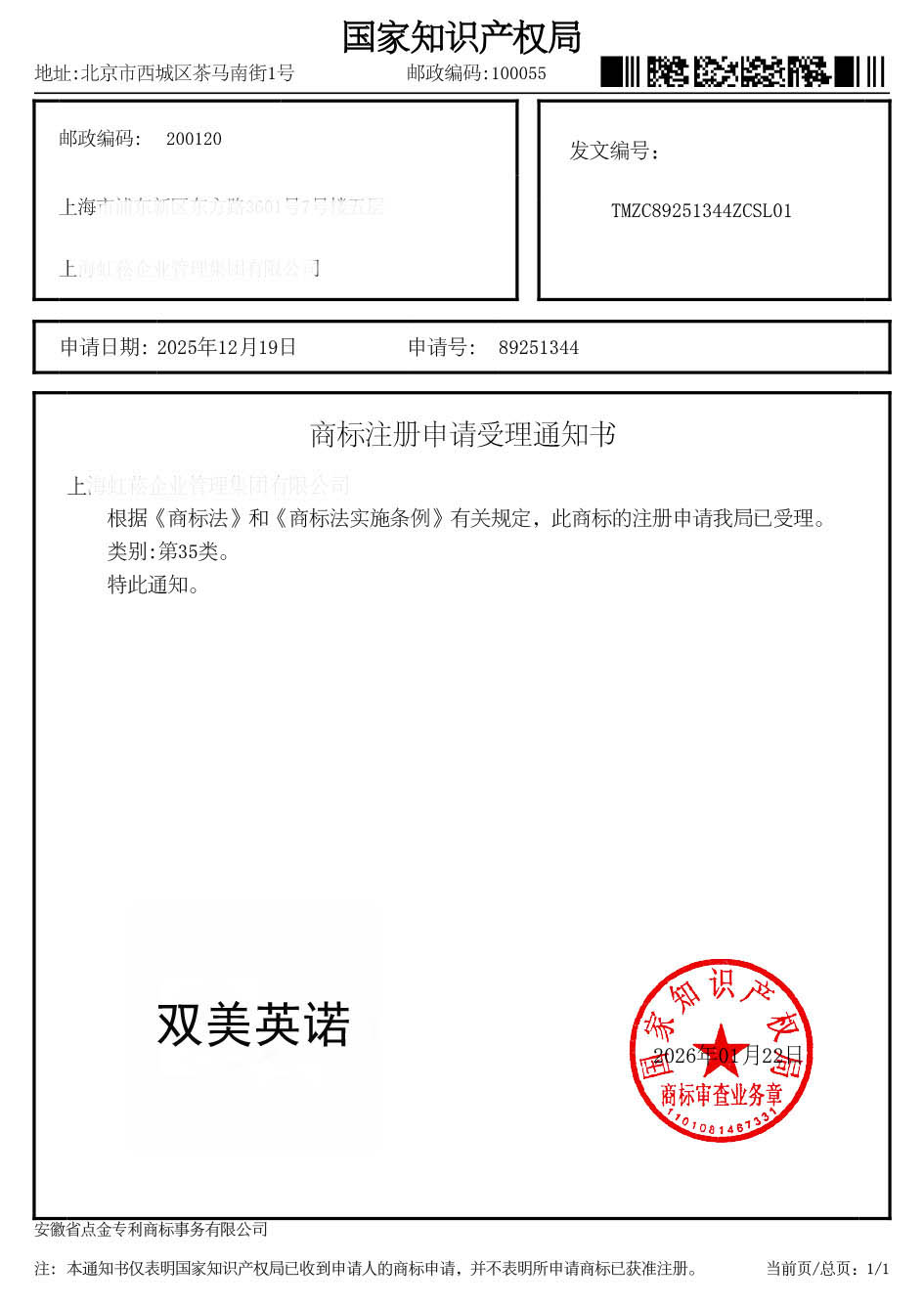 第35类“双美英诺”商标受理通知书