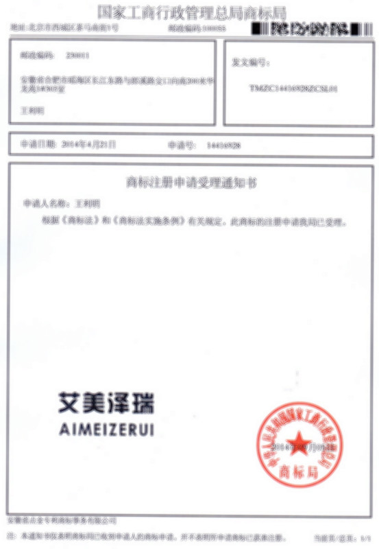 第19类“艾美泽瑞AIMEIZERUI”商标受理通知书