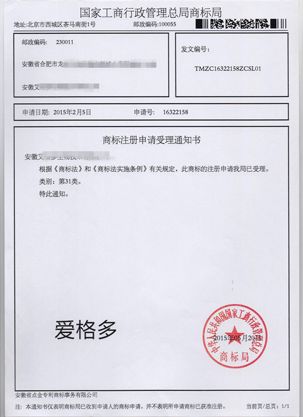 第31类“爱格多”商标受理通知书