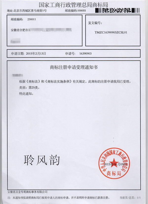 第25类“聆风韵”商标受理通知书