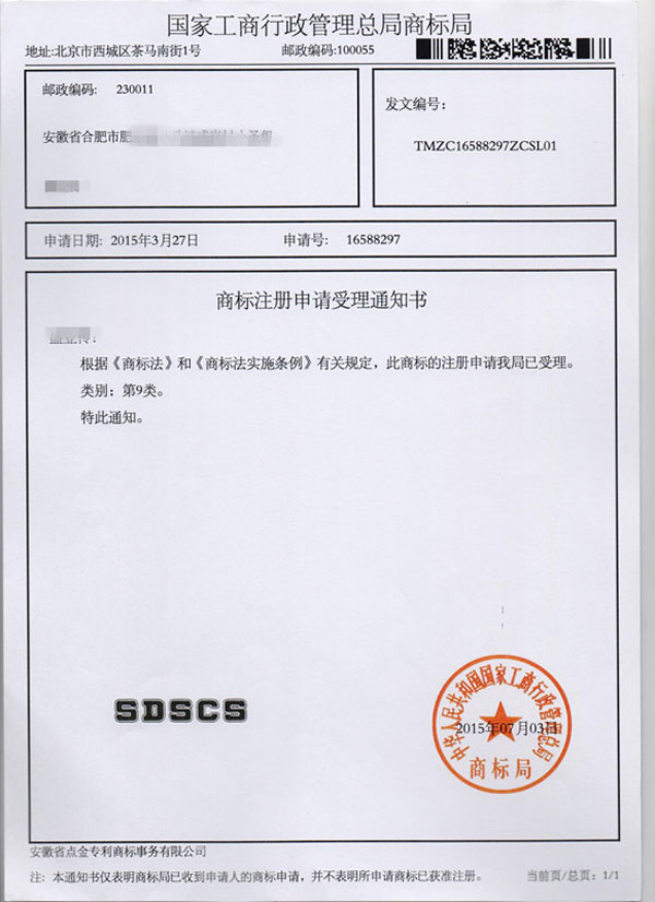 第9类“SDSCS”商标受理通知书