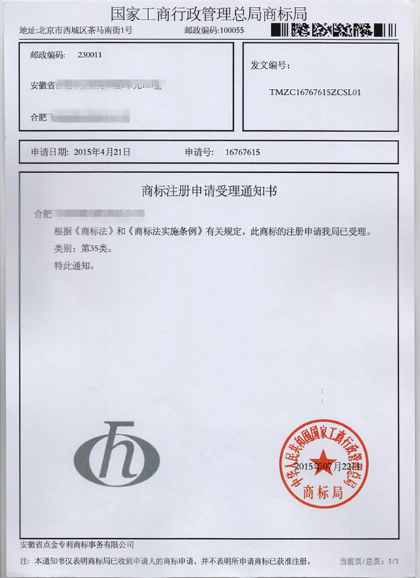 第35类字头h商标受理通知书