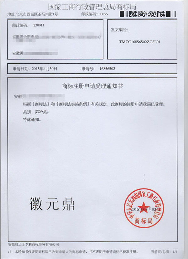 第29类“徽元鼎”商标受理通知书