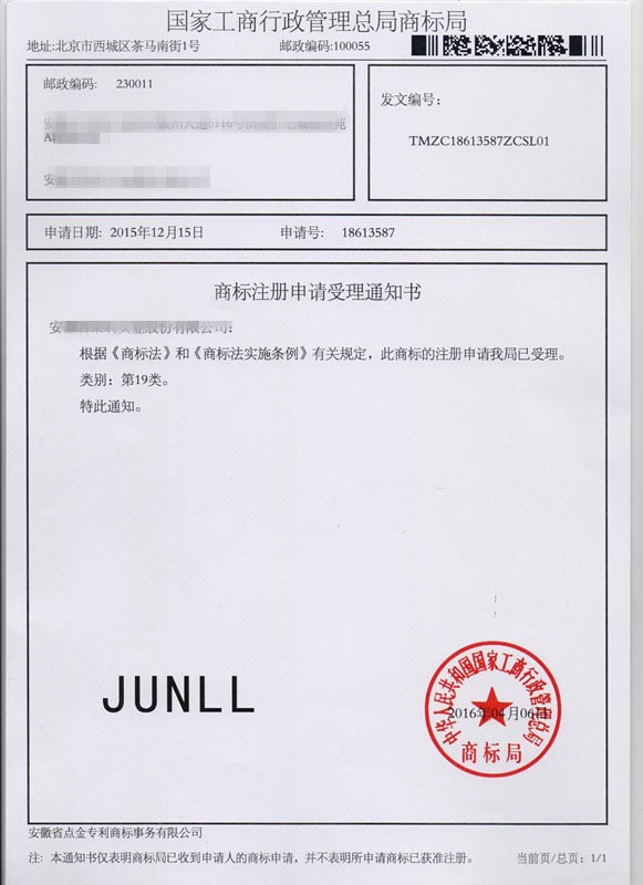第19类“JUNLI”商标受理通知书