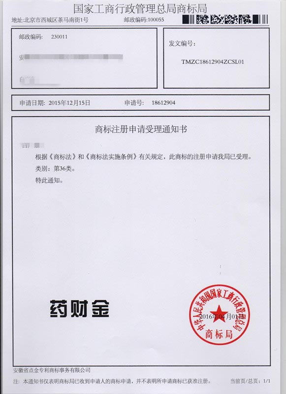 第36类“药财金”商标受理通知书