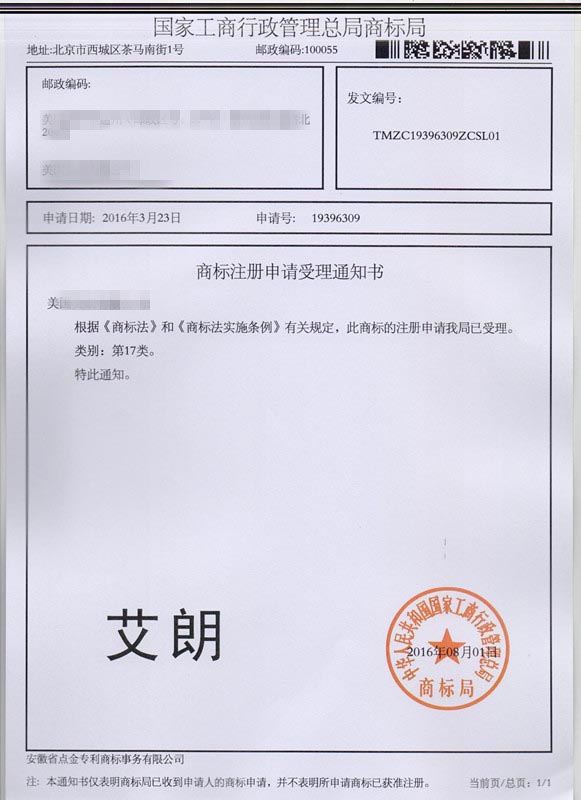 第17类“艾朗”商标受理通知书