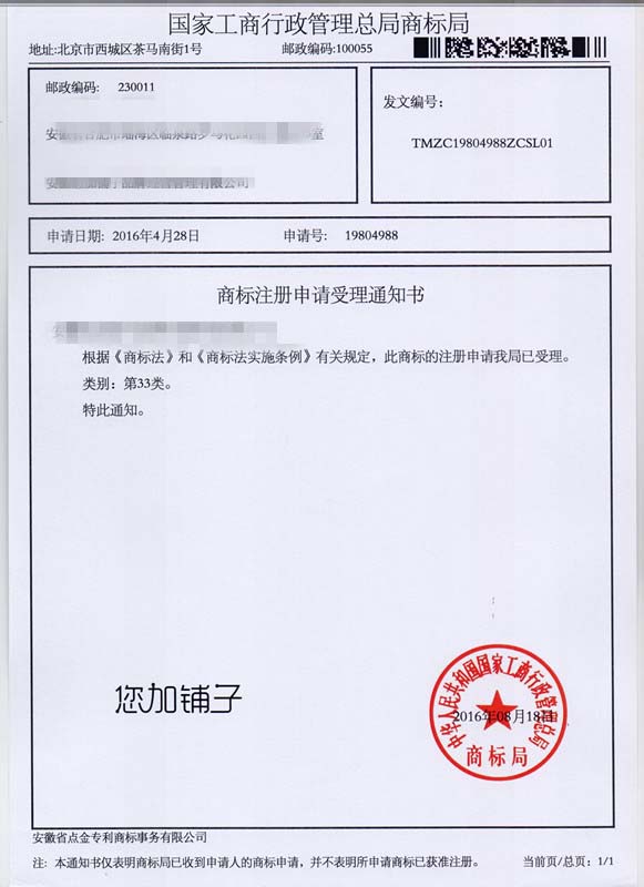 第33类“您加铺子”商标受理通知书