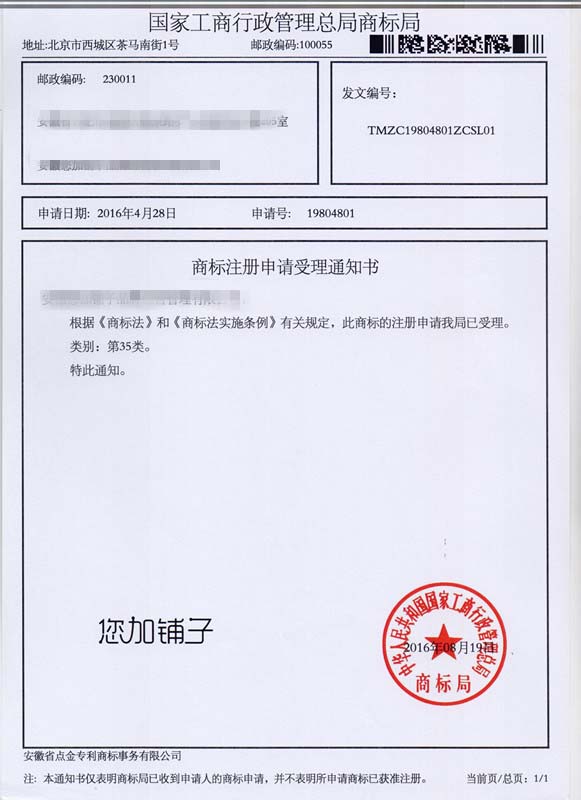 第35类“您加铺子”商标受理通知书