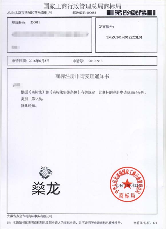 第35类“燊龙”商标受理通知书