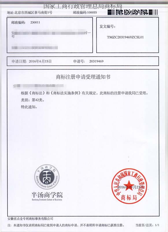 第42类“半汤商学院”商标受理通知书
