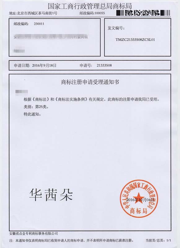 第25类“华茜朵”商标受理通知书