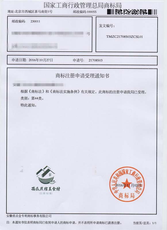 第44类“西瓜民宿美食村”商标受理通知书
