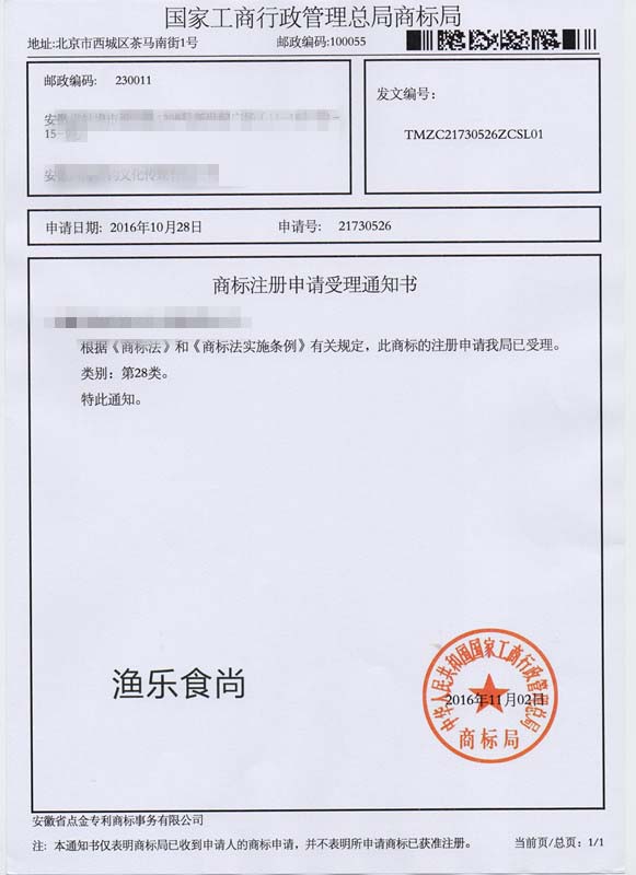 第28类“渔乐食尚”商标受理通知书