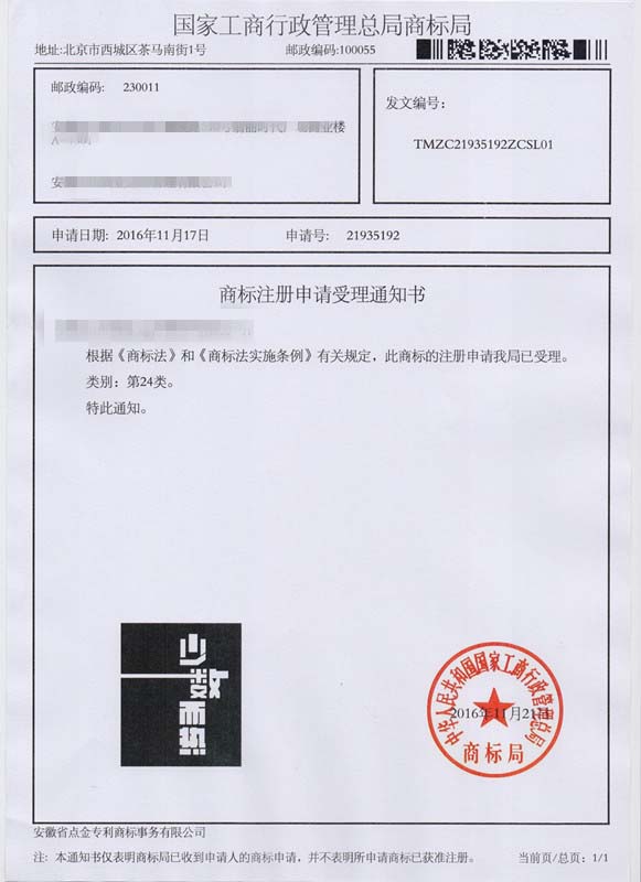 第24类“少数而热”商标受理通知书