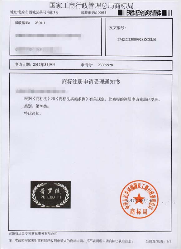 第30类“普罗缇 PU LUO TI”商标受理通知书