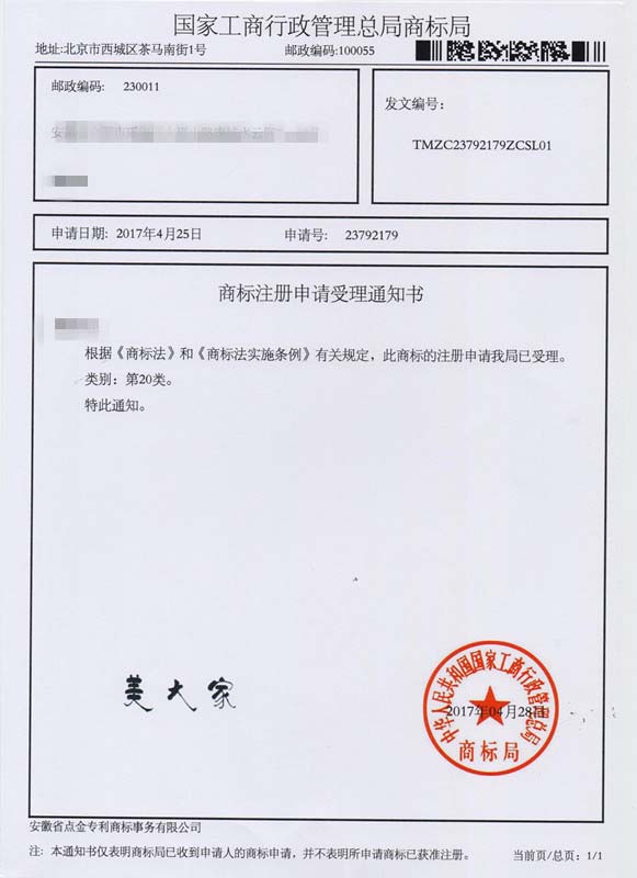 第20类“美大家”商标受理通知书