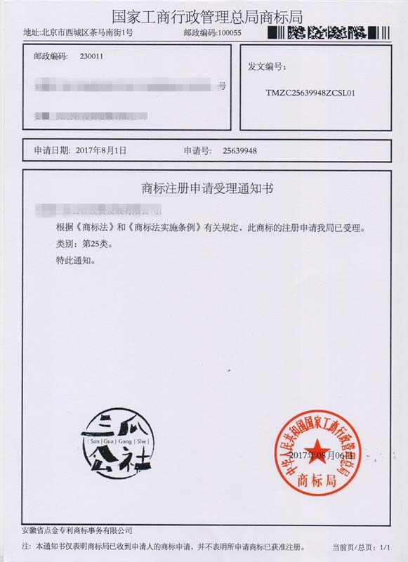 第25类“三瓜公社 SAN GUA GONG SHE”商标受理通知书