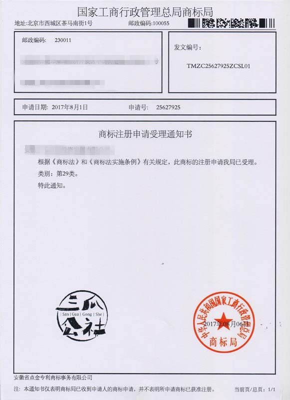 第29类“三瓜公社 SAN GUA GONG SHE”商标受理通知书