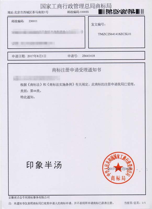 第44类“印象半汤”商标受理通知书