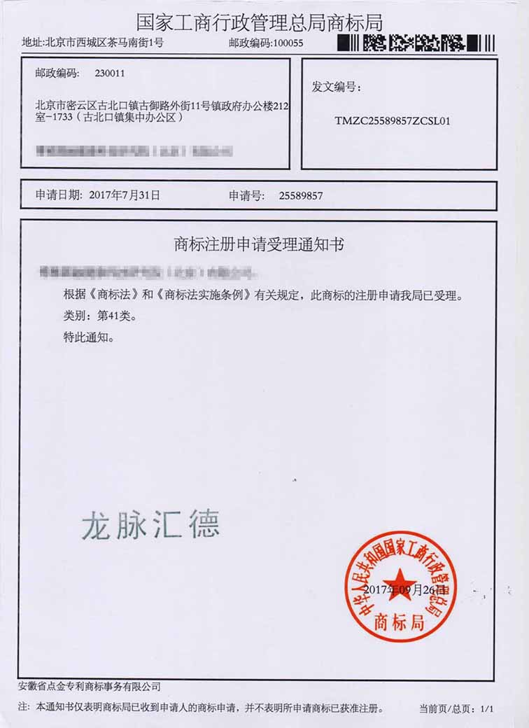 第41类“龙脉汇德”商标受理通知书