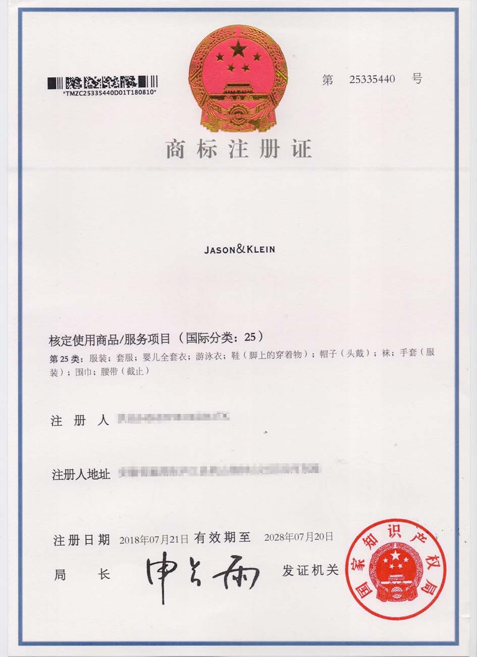 第25类“JASON&KLEIN”商标注册证