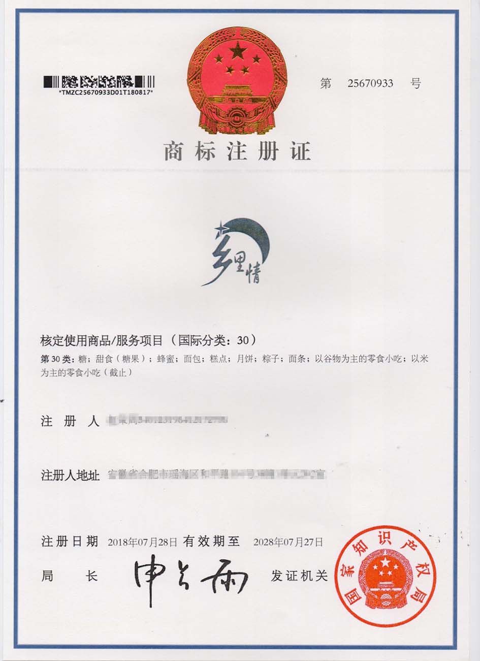 第30类“乡里情”商标注册证