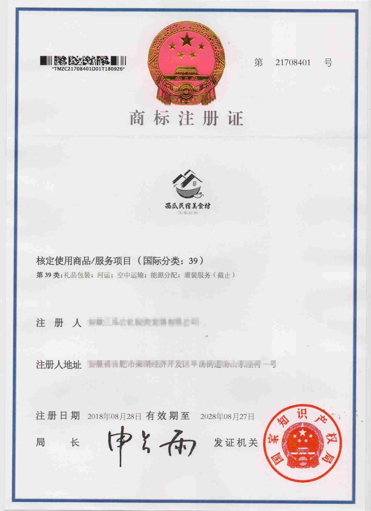 第39类“西瓜民宿美食村 三瓜公社”商标注册证