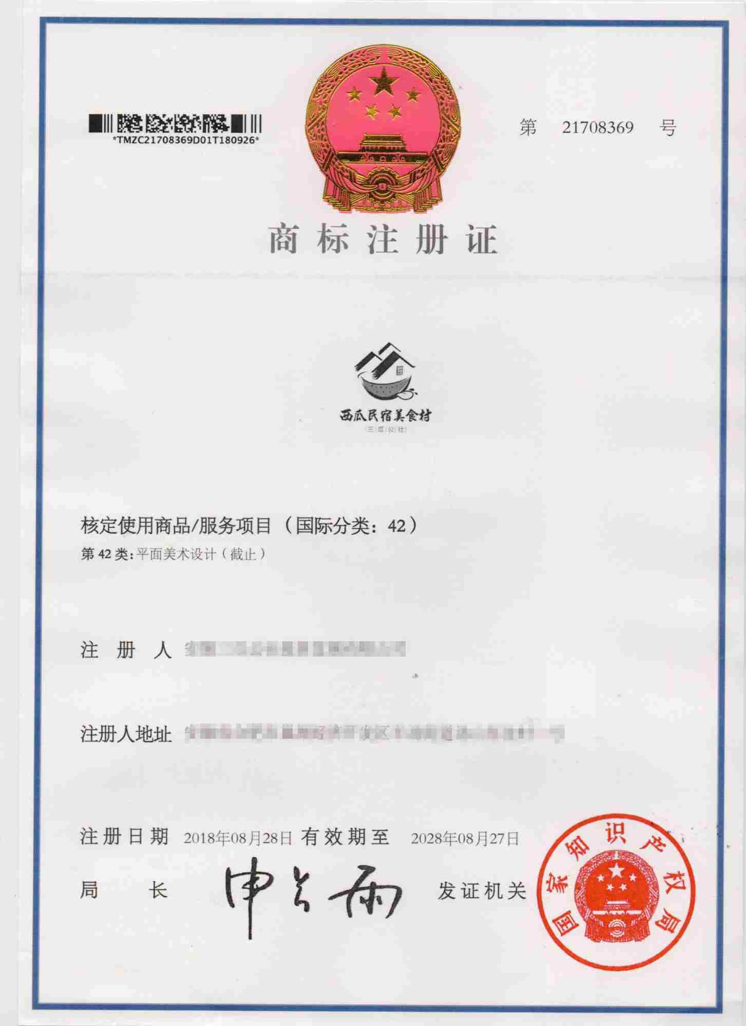第42类“西瓜民宿美食村 三瓜公社”商标注册证