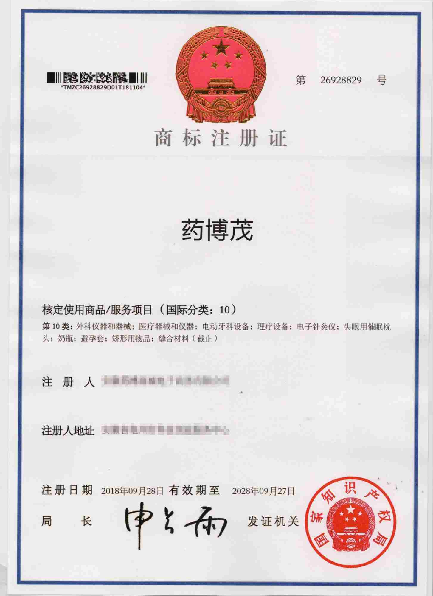 第10类“药博茂”商标注册证