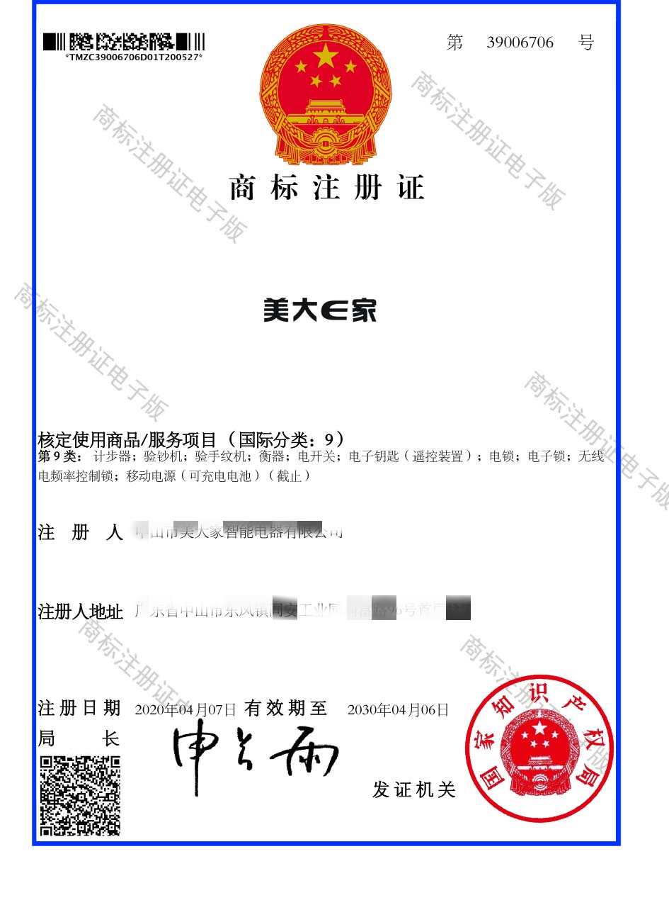 第9类“美大E家”商标注册证
