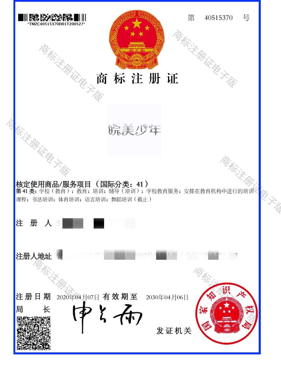 第41类“皖美少年”商标注册证
