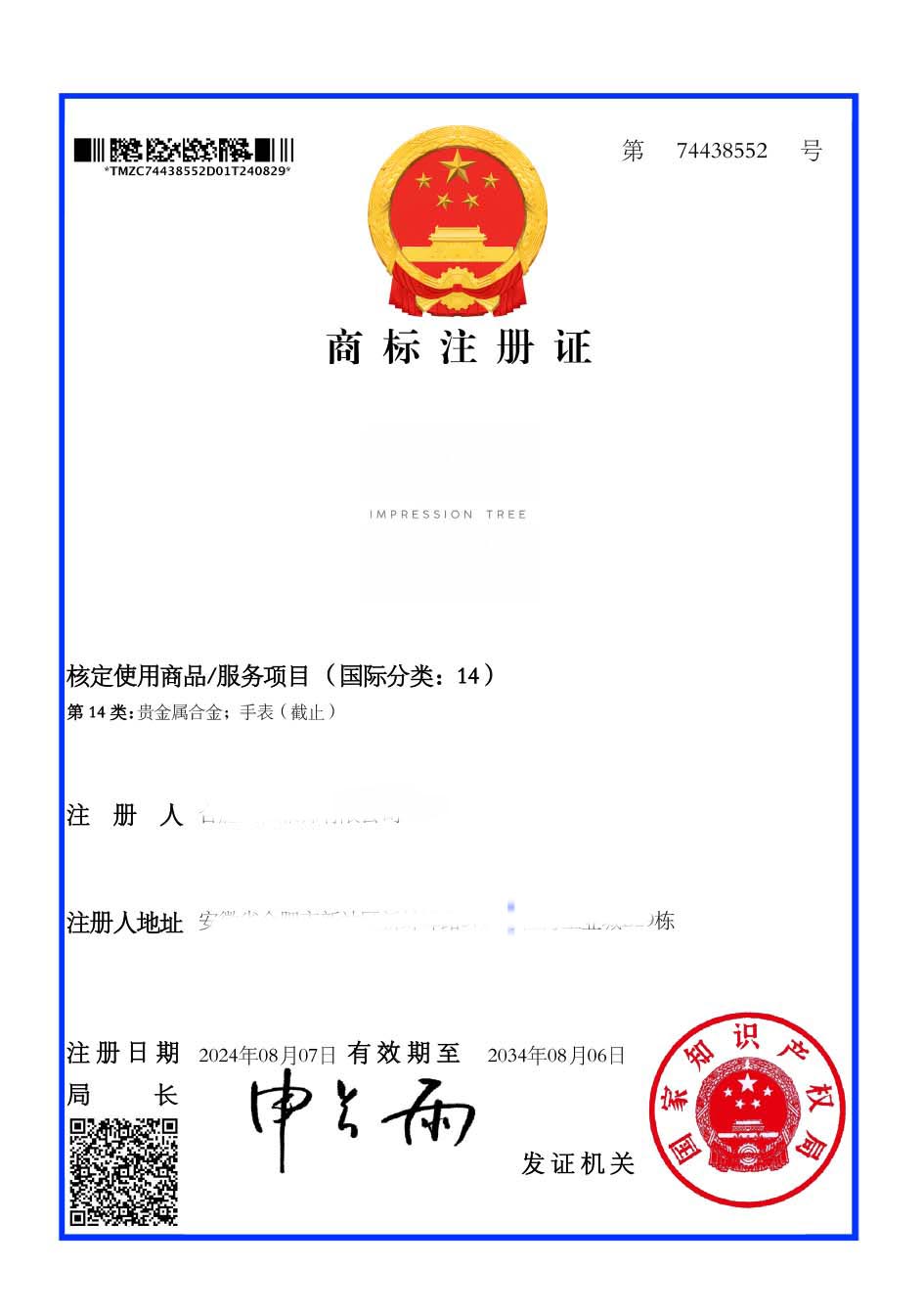 第14类“IMPRESSION TREE”商标注册证