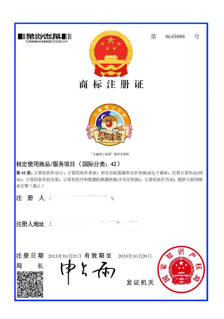 第42类“儿童网上乐园 摩尔庄园”商标注册证