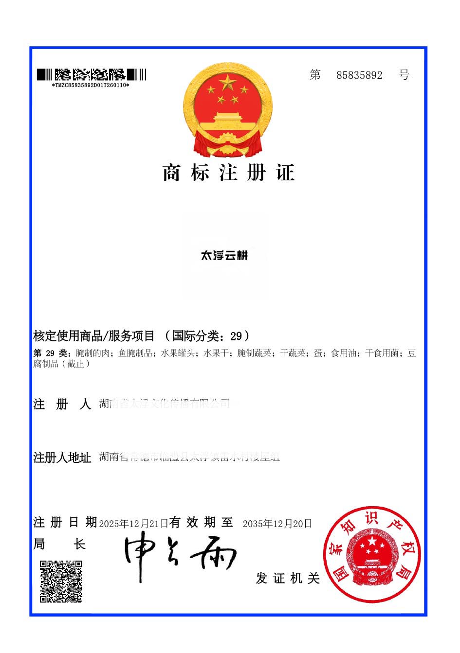 第29类“太浮云耕”商标注册证