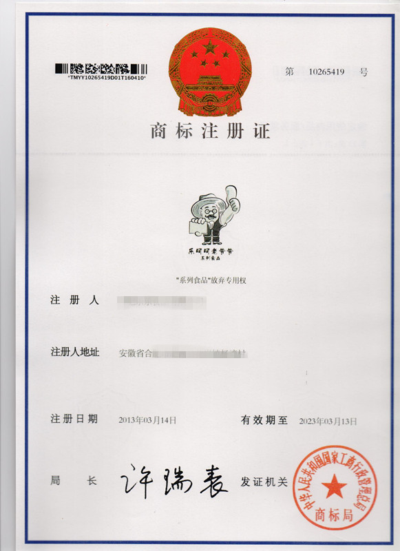 第29类“乐呵呵老爷爷”及图形商标注册证