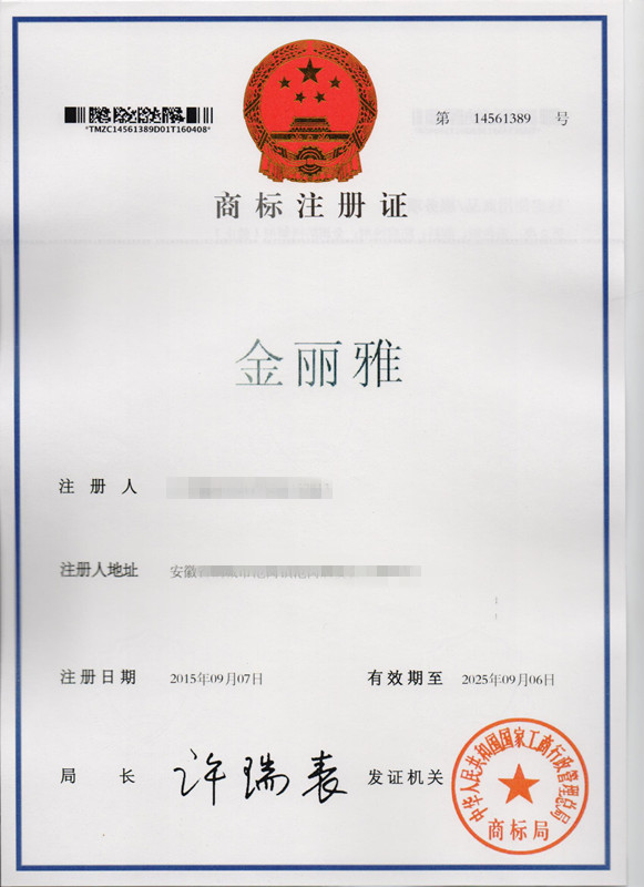 第29类“金丽雅”商标注册证