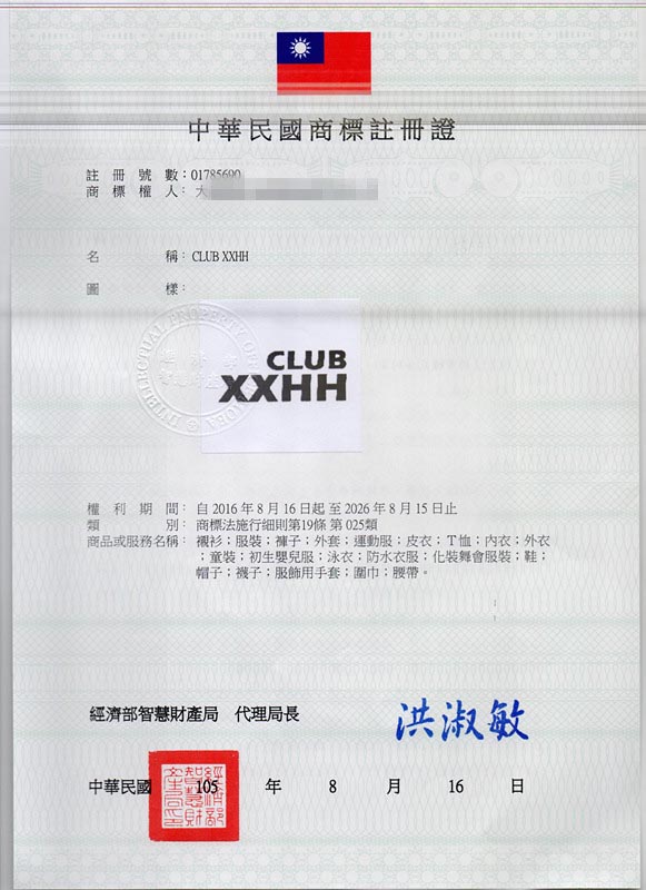 第25类“CLUB XXHH”台湾商标注册证