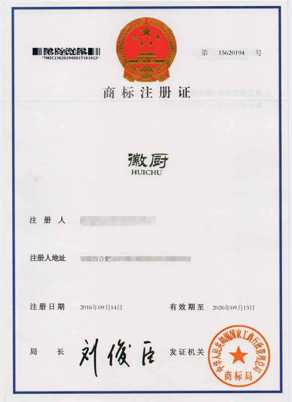 第29类“徽橱”商标注册证