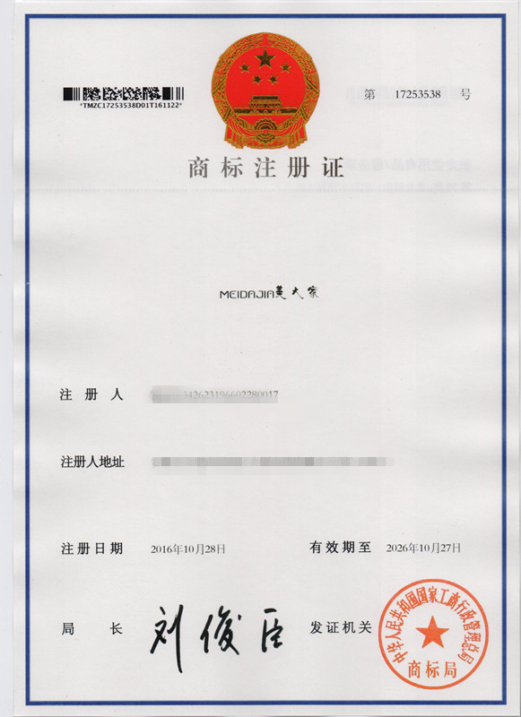 第20类“MEIDAJIA 美大家”商标注册证
