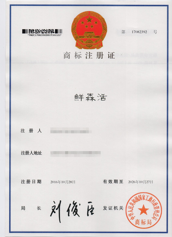第31类“鲜森活”商标注册证
