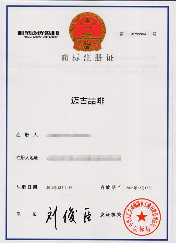 第43类“迈古喆啡”商标注册证